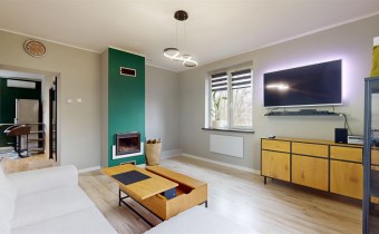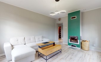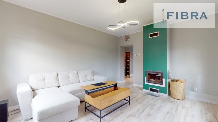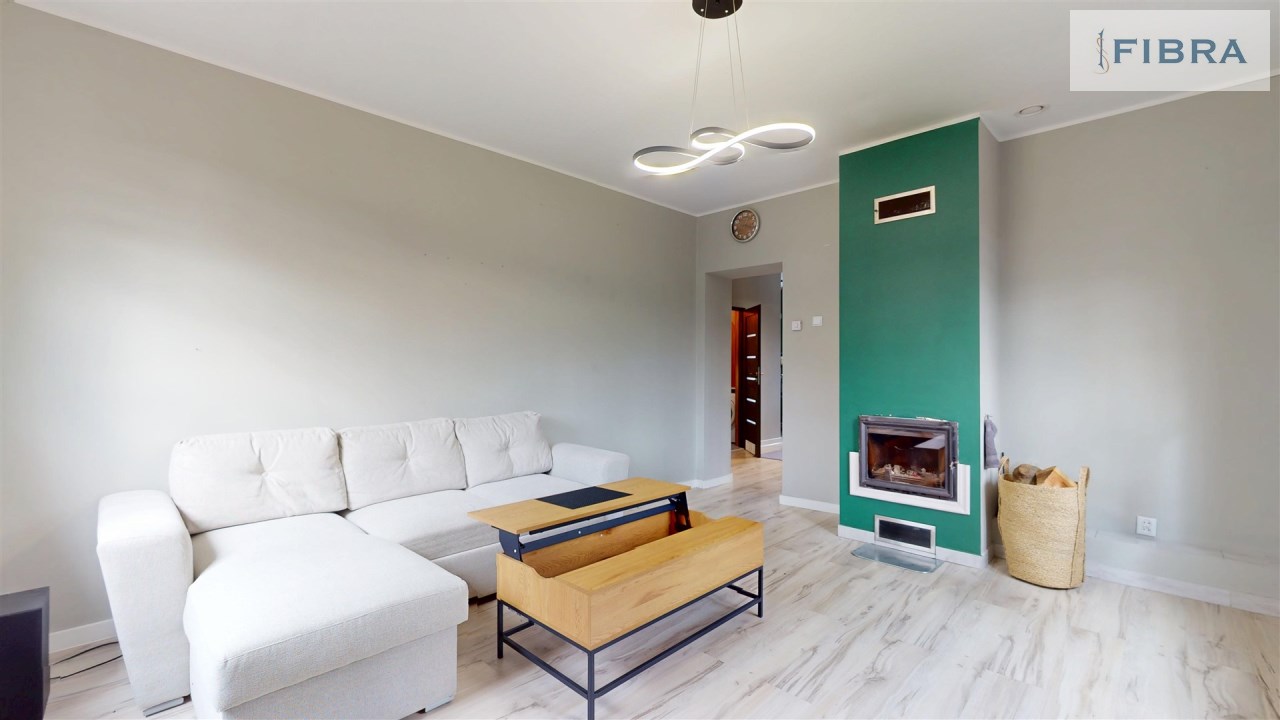 ✔ Salon: beżowy narożnik, drewniane meble, stolik kawowy, komoda, telewizor + kominek z rozprowadzeniem ciepła na kuchnię i pokój – nie tylko tworzy przytulny klimat, ale również ogrzewa całe mieszkanie