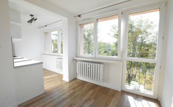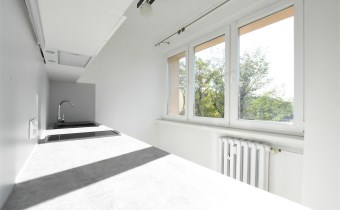 - jeden duży pokój z wnęką z aneksem kuchennym, przedpokój, łazienka,